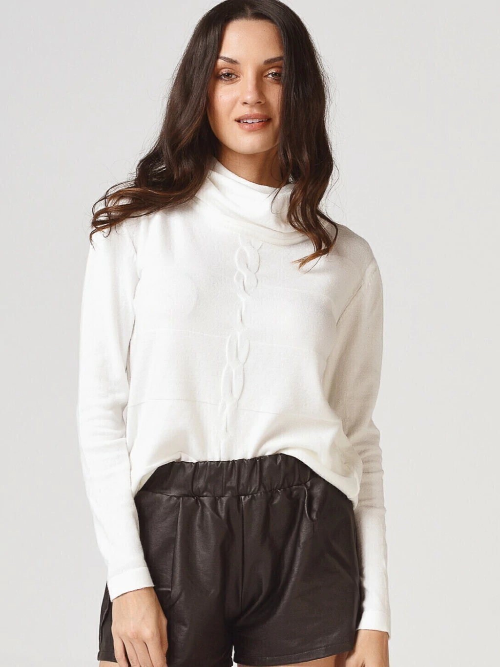 Polerón con cuello volcado y detalle de gran trenza en el frente. Tiene lycra y es muy suave al tacto. Ideal para primera piel.