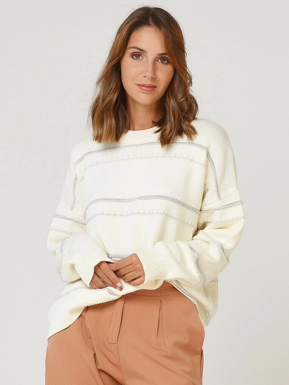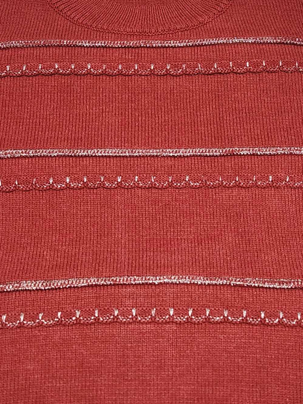 Delicado sweater escote redondo cuello a la base de hombros caídos y con terminación de puños en mangas y ruedo. Tiene una raya y unas onditas tejidas con lúrex plata que alterna en toda la prenda abarcando frente, espaldas y mangas Es talle único y mide apoyado sobre una superficie plana de largo desde el hombro al ruedo 55 cm de largo de manga 51 cm y de ancho a la altura del busto 57 cm y a la altura de la cadera 50 cm de costura a costura. Composición del Tejido: 50% Algodón - 50% Lana así que a la hora de lavar podés usar lavarropas y un buen centrifugado. Referencias: La modelo mide 1,73 #Recordá que somos fabricantes y todos nuestros productos están confeccionados con la misma materia prima, equipamiento y tecnología que las mejores marcas de shopping. Estamos seguros que lo notarás al recibir tu compra, pero si no te gusta, no te queda, o simplemente no es lo que esperabas tenés 30 días para cambios y devoluciones. |